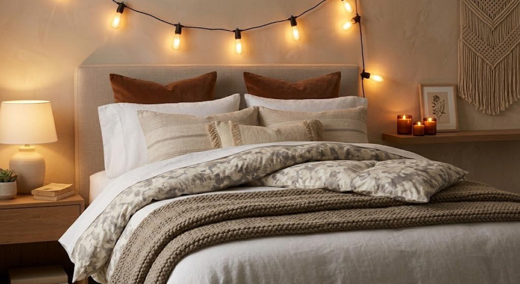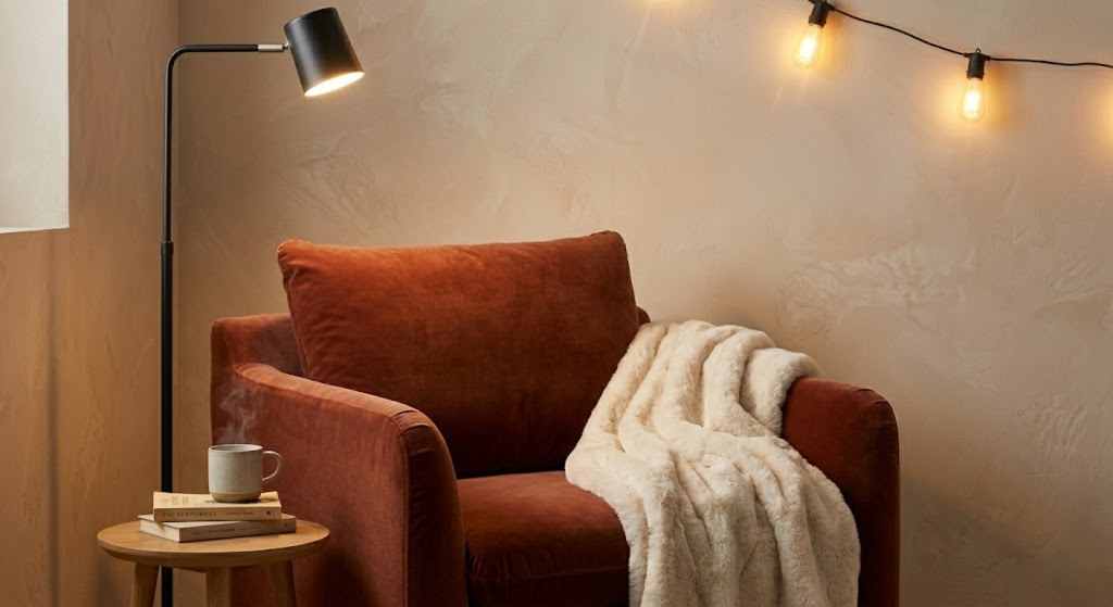 - Use warm lighting instead of white — it instantly feels cozy