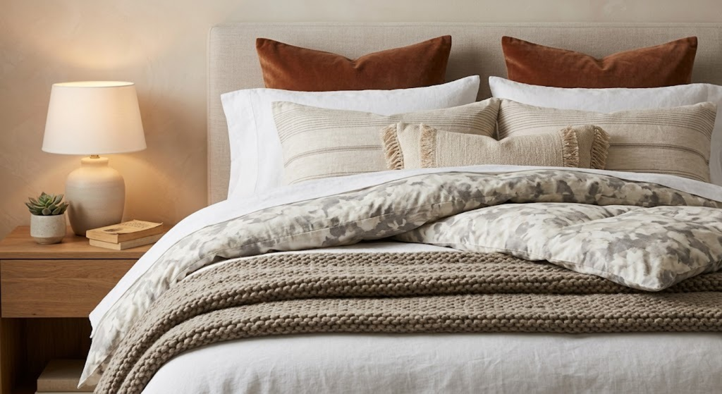 - Layer your bed (blanket + cushions = luxury feel)